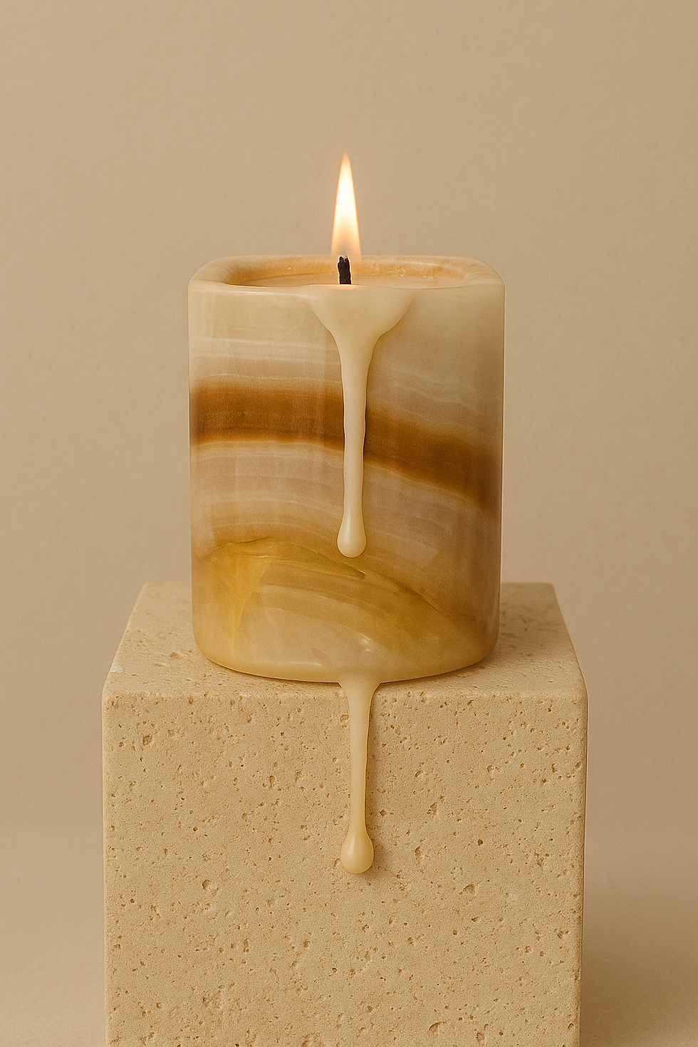 El tarro, tallado en piedra natural de Onyx, incluye una tapa que preserva intacta la fragancia. Este material convierte a cada vela en una pieza irrepetible, que transformará tu casa en hogar.